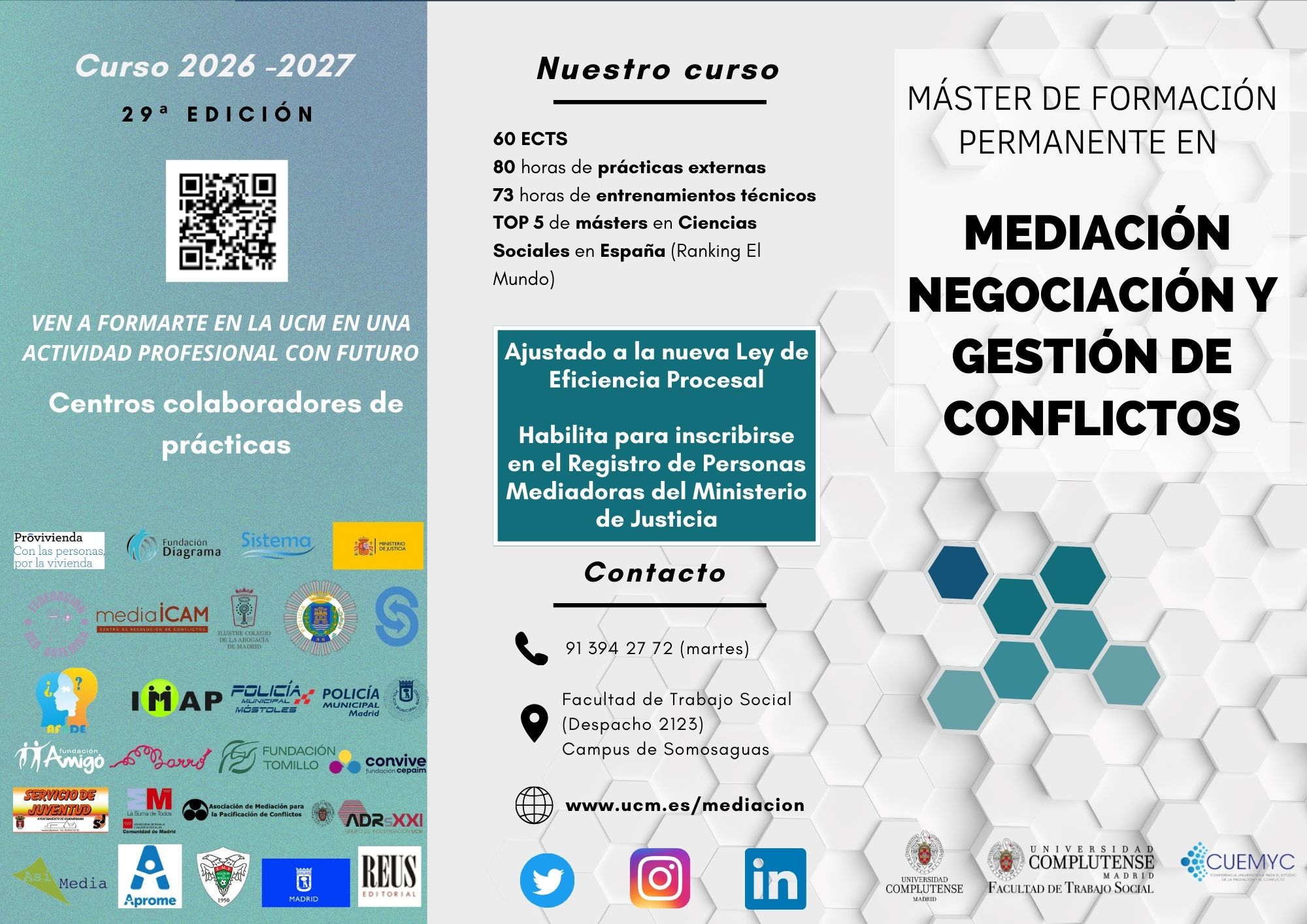 Con la Mediación y los MASC (Métodos Adecuados de solución de controversias), aprendemos a favorecer la solución positiva de los conflictos y a transformar pacíficamente las interrelaciones propiciando consensos. Desde esta convicción, en la Universidad Complutense de Madrid, venimos formando profesionalmente a personas mediadoras y gestoras de conflictos, desde hace 28 años, capacitándoles en las competencias necesarias para desarrollar de modo eficaz y responsable estas metodologías en ámbitos muy diversos.