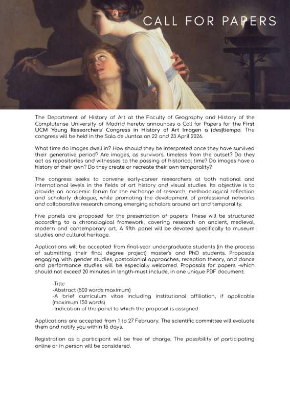CFP: I Congreso de Jóvenes Investigadores en Historia del Arte UCM Deadline: 27/02/2026 2 feb 2026 - 13:18 CET Galería Imágenes Volver »