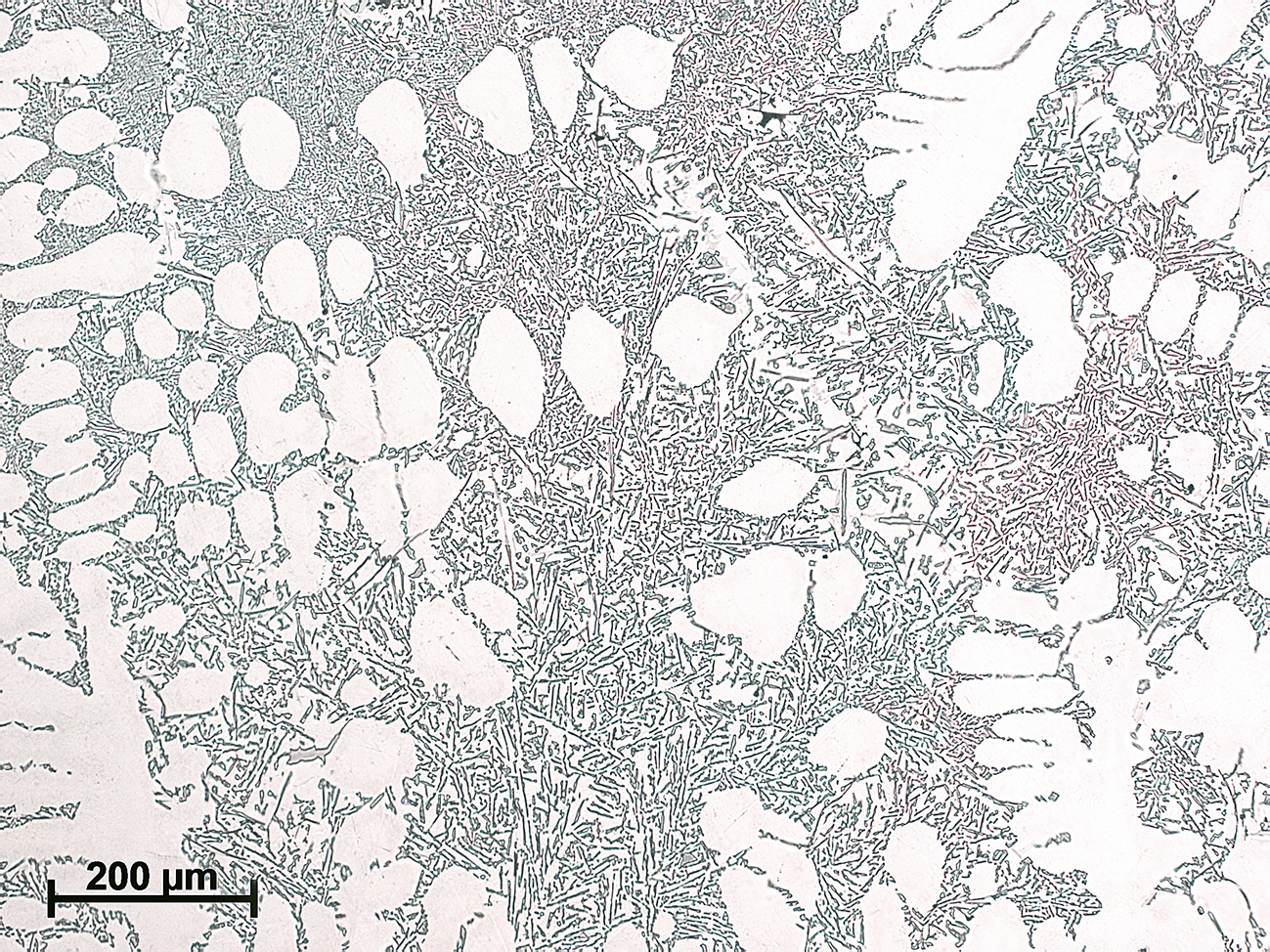 Microestructura dendrítica característica de las aleaciones de moldeo donde se observan dendritas primarias de fase α-Al y un eutéctico Al-Si situado en los espacios interdendríticos. En la micrografía a mayores aumentos se observa la morfología acicular del Si eutéctico, así como la presencia de un compuesto intermetálico en forma de gruesas agujas identificado como β-AlFeSi. Éste se forma como consecuencia de la presencia de impurezas de Fe y resulta perjudicial tanto desde el punto de vista de la resistencia mecánica, ya que puede actuar como elevadores de tensiones, como a la corrosión, debido a su comportamiento catódico.