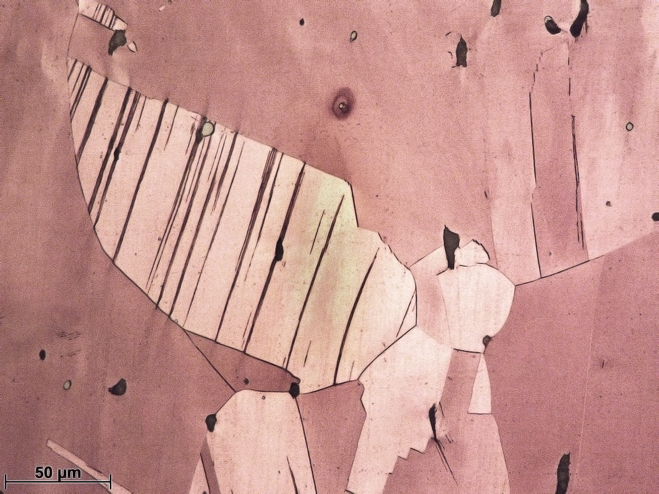 La deformación por compresión posterior en un tornillo de banco, con cuidado de no dañar la superficie pulida, da lugar a una superficie ligeramente arrugada donde se pueden observar los granos de fase α con cierto relieve, al haberse inclinado por la deformación, así como haces de líneas paralelas o bandas de deslizamiento dentro de cada grano. En algunos casos, estos haces de líneas se intersectan correspondiendo a distintos sistemas de deslizamiento.