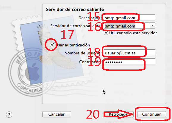 20. Cliqueamos sobre Continuar. Nos aparece la ventana de Servidor de correo saliente.
