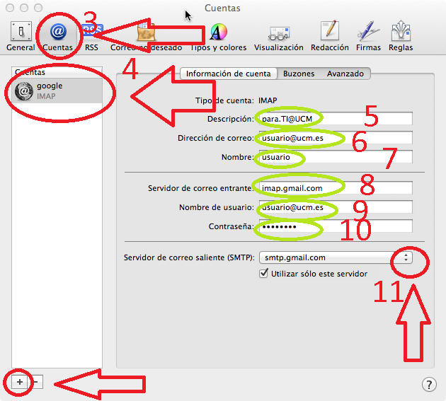 11. En Servidor de correo entrante, pondremos imap.gmail.com