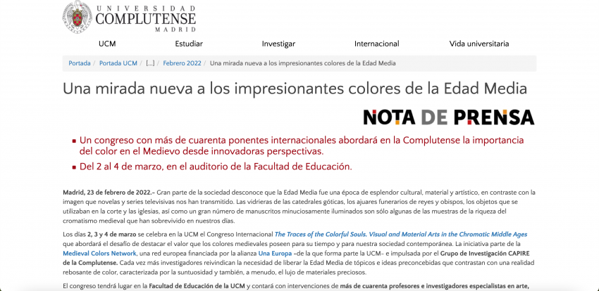 Gran parte de la sociedad desconoce que la Edad Media fue una época de esplendor cultural, material y artístico, en contraste con la imagen que novelas y series televisivas nos han transmitido. Las vidrieras de las catedrales góticas, los ajuares funerarios de reyes y obispos, los objetos que se utilizaban en la corte y las iglesias, así como un gran número de manuscritos minuciosamente iluminados son sólo algunas de las muestras de la riqueza del cromatismo medieval que han sobrevivido en nuestros días.