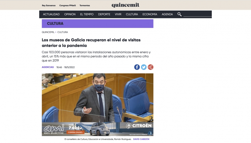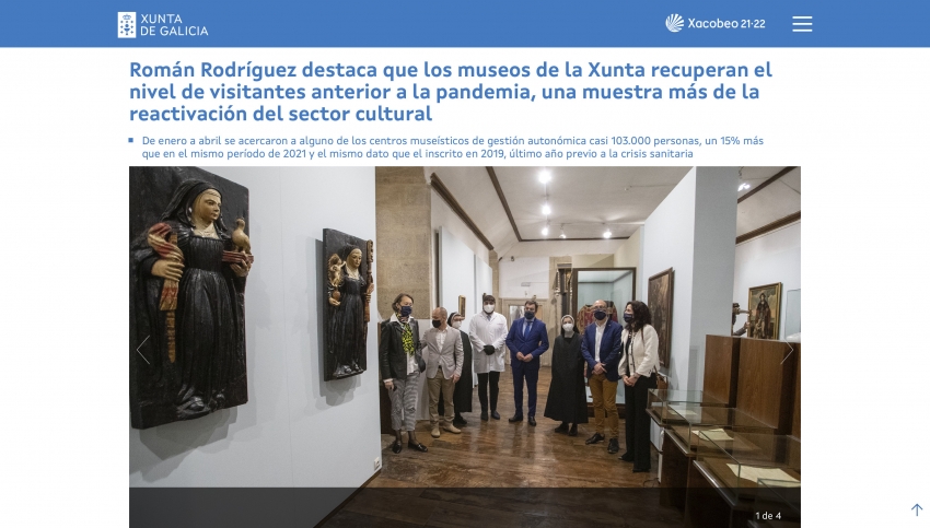 O conselleiro de Cultura, Educación, FP e Universidades, Román Rodríguez, destacou que os museos autonómicos xa recuperaron o nivel de visitantes anterior á pandemia, "unha mostra máis da reactivación do sector cultural". Segundo informou, entre xaneiro e abril achegáronse a algún dos centros museísticos de xestión autonómica case 103.000 persoas, un 15% máis que no mesmo período do ano pasado.