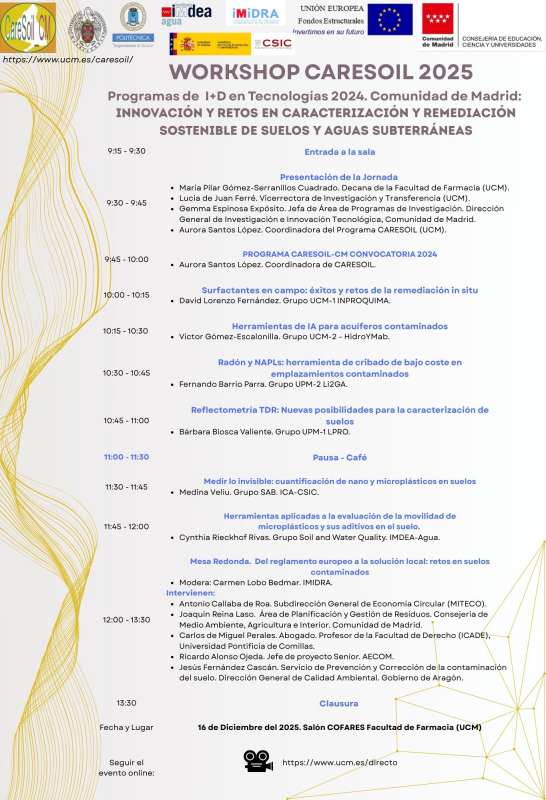 El programa de investigación CARESOIL celebró ayer con gran éxito el Workshop CARESOIL 2025, que tuvo lugar en la Facultad de Farmacia, en el aula COFARES, reuniendo a investigadores, profesionales y expertos del ámbito de la gestión y remediación de suelos y aguas subterráneas contaminadas.