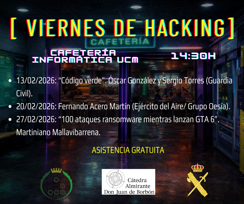 A partir del 13 de febrero, celebraremos en la cafetería de la Facultad de Informática, los “Viernes de Hacking” a partir de las 14:30. Tendremos ponentes de diferentes procedencias, y todos con la ciberseguridad como denominador común.