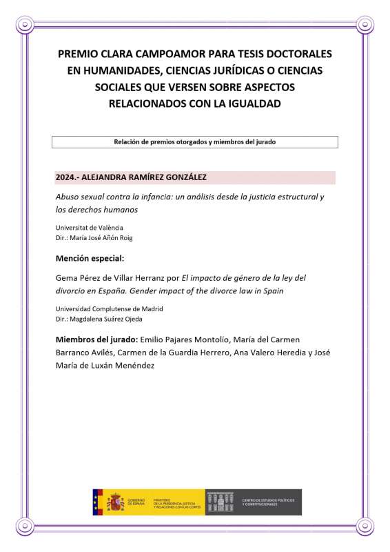 Gema Pérez del Villar, doctora en Estudios Feministas y de Género (Instifem-UCM) ha obtenido la Mención Especial del Premio Clara Campoamor 2026 otorgado por el Centro de Estudios Políticos y Constitucionales. Su tesis se publicará en breve a través de esta institución.