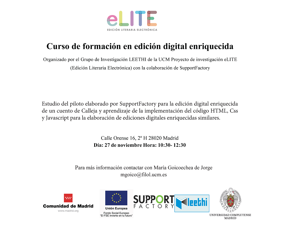 - María Goicoechea de Jorge (mgoico@filol.ucm.es), responsable del proyecto eLITE (Edición Literaria Electrónica) y profesora del Departamento de Filología Inglesa II, de la UCM.