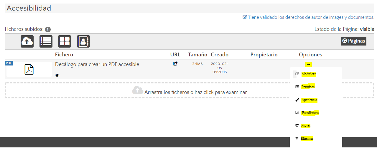 - Parte superior izquierda: Información sobre el número de archivos subidos a la página (ficheros subidos). La imagen superior muestra un sólo archivo subido a la página "Acesibilidad").