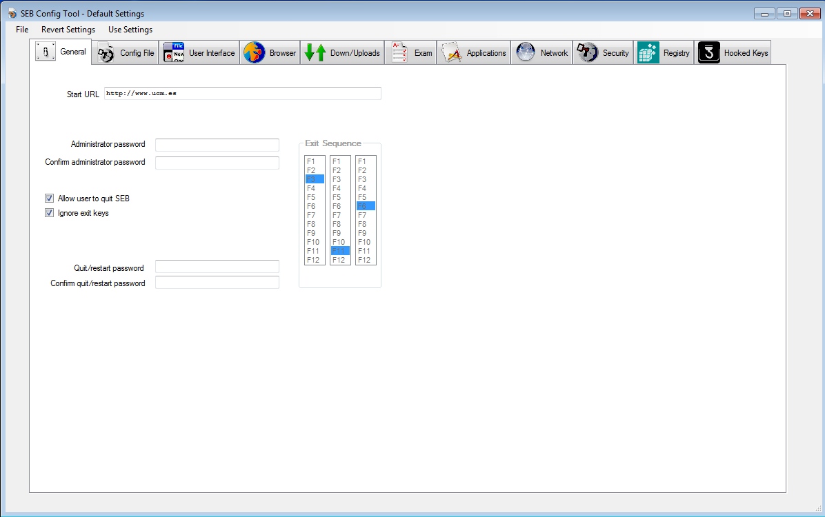- Por defecto, el navegador SEB no permitirá acceder a otras utilidades que pudieran ser útiles para la realización del examen (por ejemplo, entornos de programación). Si se desea habilitarlo se deberá configurar esta funcionalidad desde SEBConfigTool.