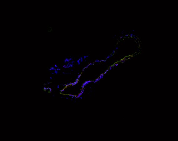 Pulmonary artery: DHE staining in red. Elastin in green and nucleus in blue.