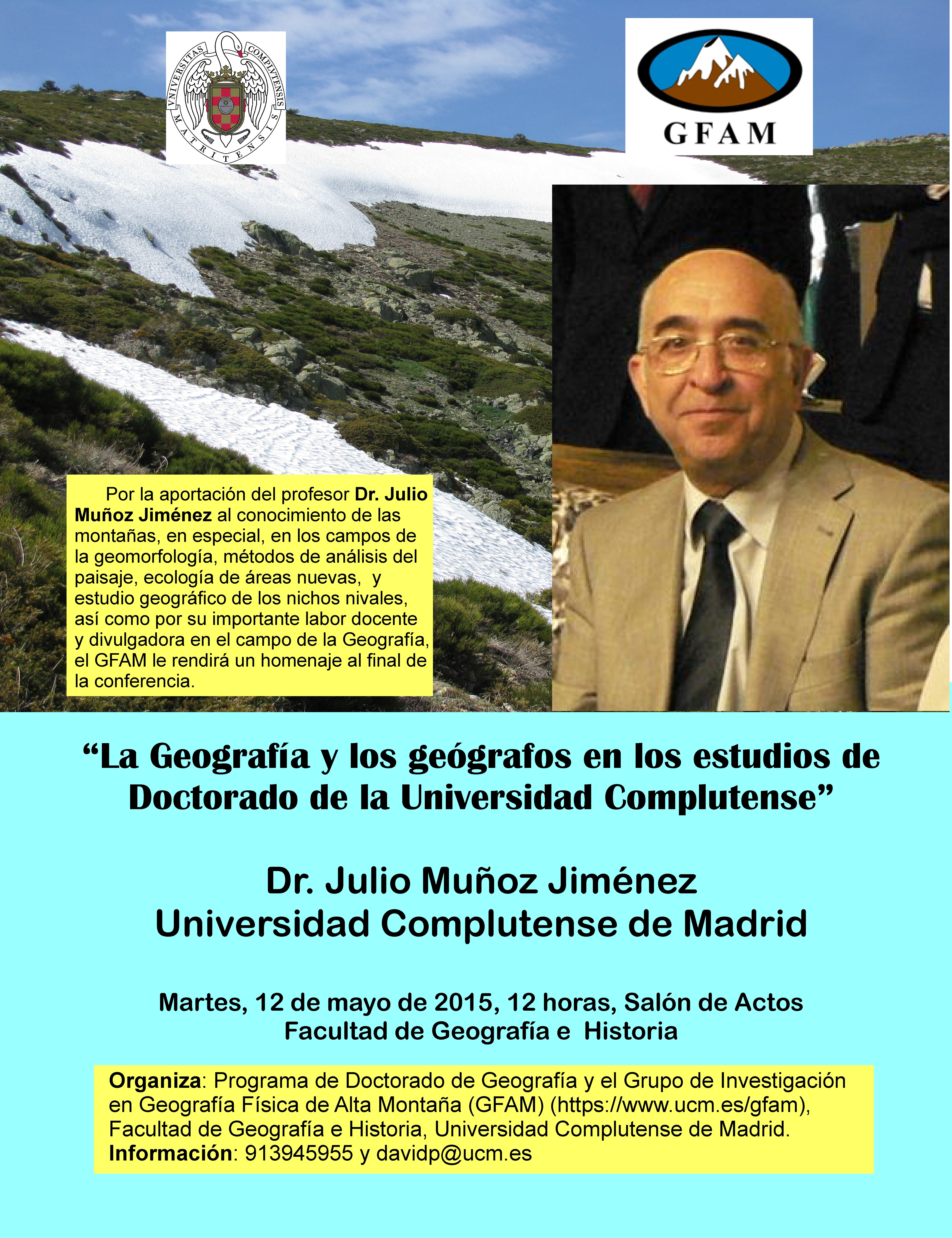 El martes 12 de mayo de 2015, el profesor Dr. Julio Muñoz Jiménez ha impartido una conferencia sobre "La Geografía y los geógrafos en los estudios de Doctorado de la Universidad Complutense de Madrid", organizada en el marco del Programa de Doctorado en Geografía del que es coordinador.
