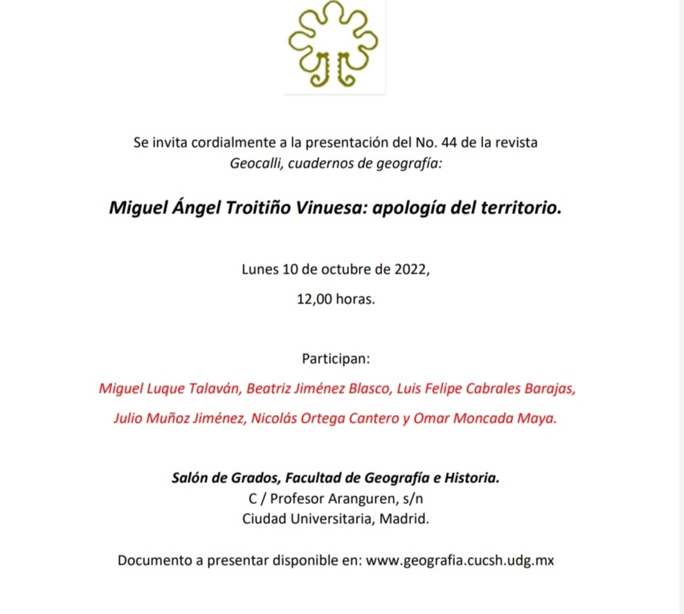 El 10 de octubre se presenta en la Facultad de Geografía e Historia el número de la revista Geocalli dedicado a Miguel Ángel Troitiño, que contiene sus últimos escritos no publicados. Lugar: Salón de Grados. Hora: 12:00. Enlace al número 44 de la revista Geocalli