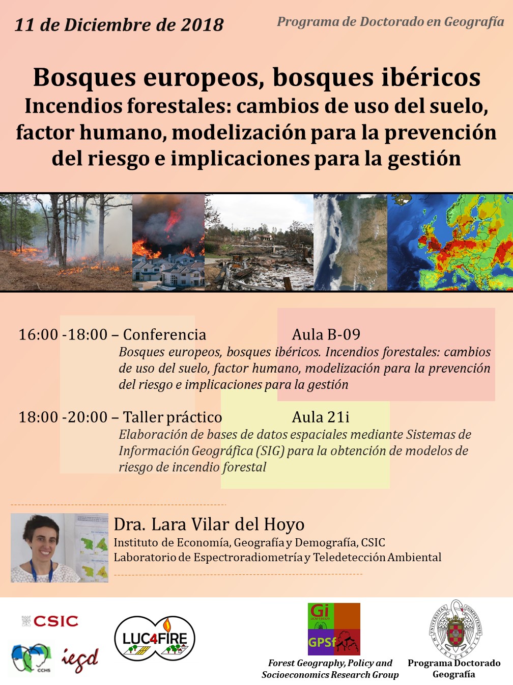 - Conferencia de la Dra. Lara Vilar del Hoyo: "Bosques europeos, bosques ibéricos. Incendios forestales: cambios de uso del suelo, factor humano, modelización para la prevención del riesgo e implicaciones para la gestión". Universidad Complutense de Madrid, Programa de Doctorado en Geografía. Facultad de Geografía e Historia, aula B-09, 11 diciembre 2018, 16h00-18h00. Descargar cartel