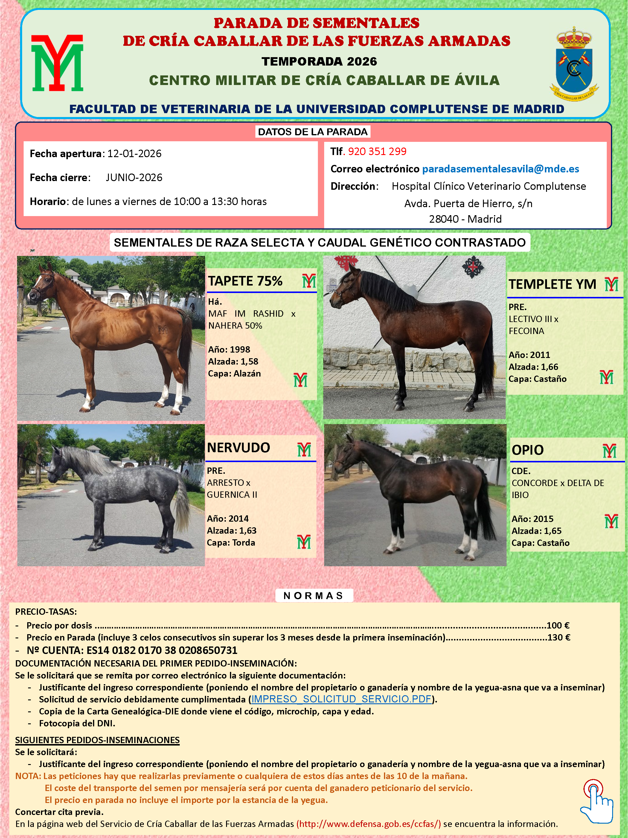 Hasta el próximo 2 de junio tenemos a disposición de todos los criadores cuatro sementales de alto valor genético en las instalaciones de nuestro Hospital Clínico Veterinario Complutense.