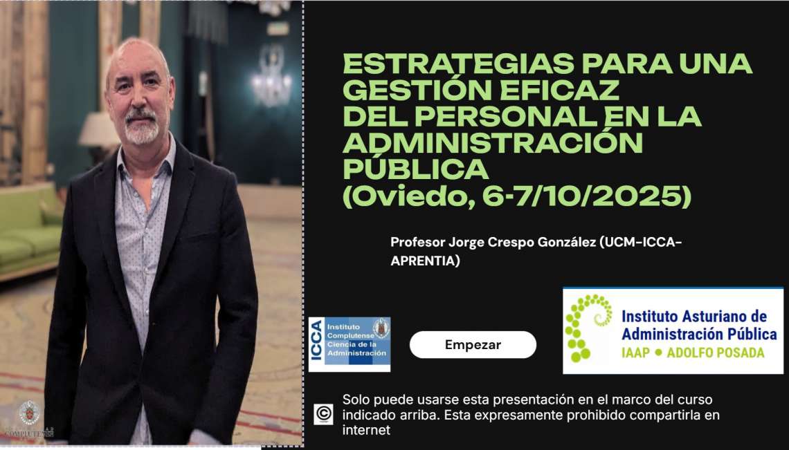 Los días 6 y 7 de octubre de 2025 los profesores Jorge Crespo y Jesús Llorente, del área de Función Pública Estratégica del ICCA, impartieron el curso “Estrategias para una gestión eficaz del personal en la Administración Pública”, organizado por el Instituto Asturiano de Administración Pública Adolfo Posada.