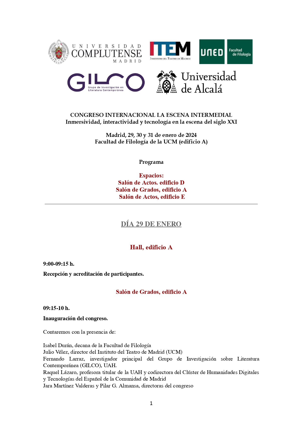 Ya tenemos el programa definitivo del Congreso Internacional La escena intermedial: Inmersividad, interactividad y tecnología en la escena del siglo XXI, que se celebrará los días 29, 30 y 31 de enero en la Universidad Complutense. Puedes consultarlo íntegramente al término de la página.