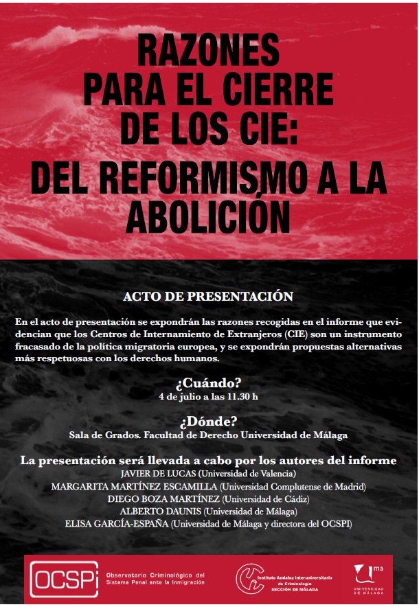 l próximo martes 4 de julio de 2017, se presenta en la Sala de Grados de la Facultad de Derecho de la Universidad de Málaga, el informe “Razones para el cierre de los CIE: del reformismo a la abolición”.