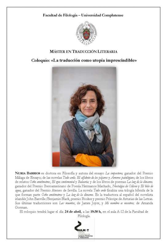 Coloquio: «La traducción como utopía imprescindible» El coloquio, a cargo de la escritora y traductora Nuria Barrios, tendrá lugar el lunes 24 de abril a las 19:30h. en el aula A-12. 20 abr 2023 - 13:24 CET Volver »