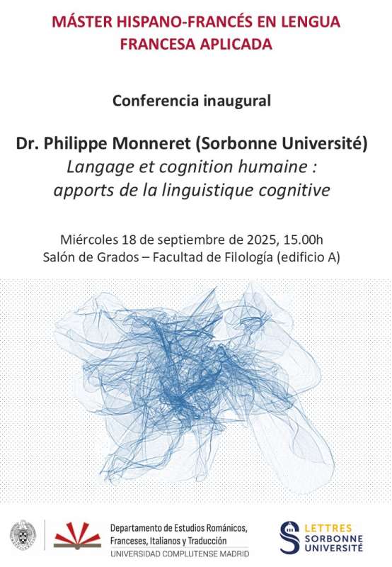 El profesor Philippe Monneret, catedrático de la Sorbonne Université y coordinador del Master FLE- Linguistique appliquée en français langue étrangère et au français de spécialité, pronunciará la conferencia inaugural del Máster en Lengua Francesa Aplicada el jueves 18 de septiembre a las 15h00 en el Salón de Grados de la Facultad de Filología (ed. A). El título de la conferencia es: "Langage et cognition humaine: apports de la linguistique cognitive".