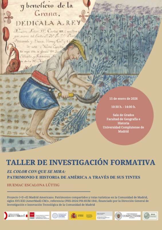 El próximo jueves 15 de enero de 2026, de 10:30 a 14:00 h, tendrá lugar en la Sala de Grados de la Facultad de Geografía e Historia (UCM) el taller “El color con que se mira: patrimonio e historia de América a través de sus tintes”, impartido por Huémac Escalona Lüttig (Universidad Nacional Autónoma de México).