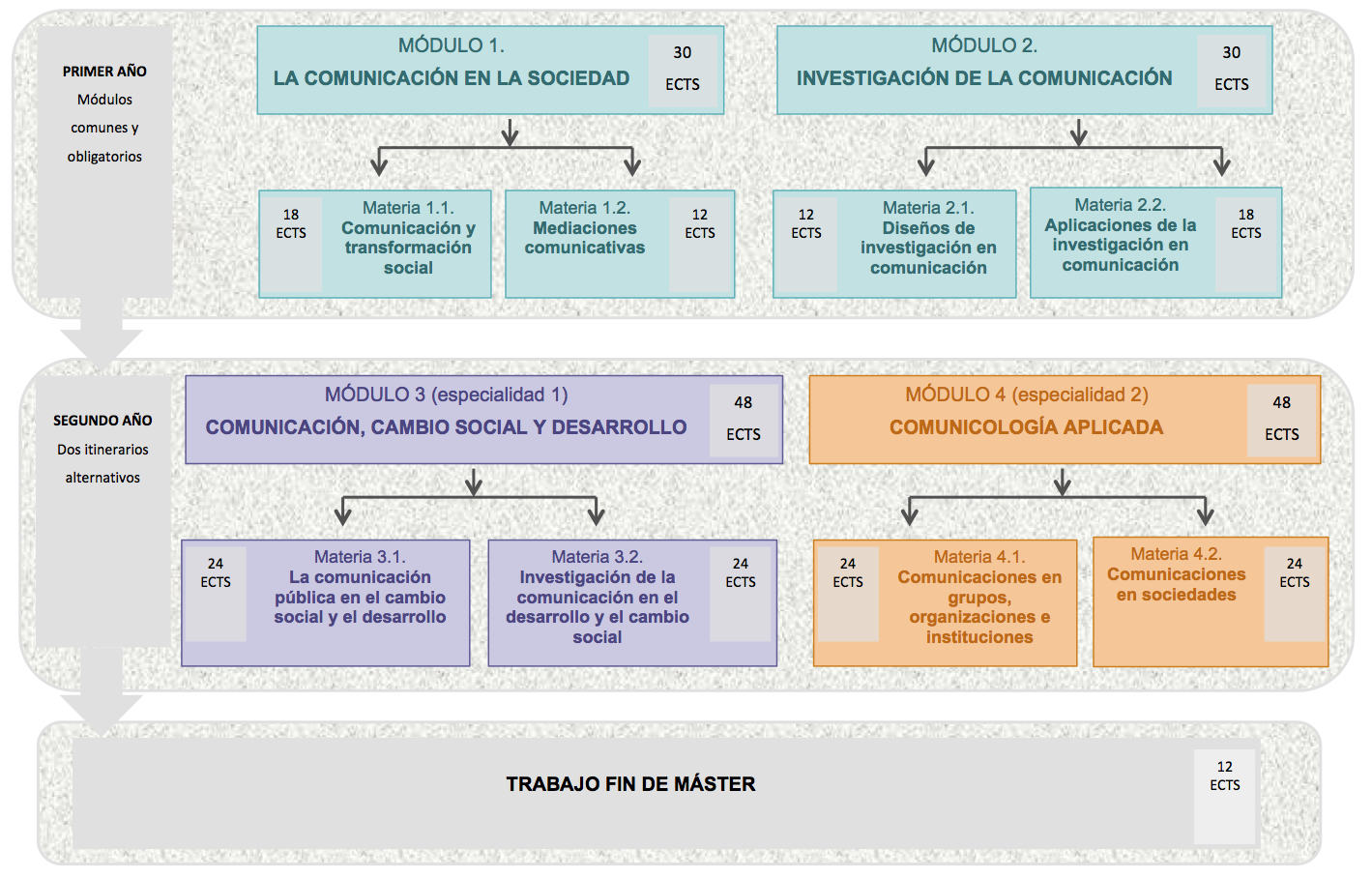 Una vez que el estudiante ha optado por uno u otro itinerario, debe cursar necesariamente las dos materias del módulo elegido (en total, 48 créditos). Además, durante el transcurso del segundo año se realiza el TRABAJO FIN DE MÁSTER. El TFM se plasma en una memoria donde el estudiante da cuenta de lo aprendido a lo largo del proceso de su titulación y de cómo ha incorporado ese aprendizaje a sus conocimientos y competencias. |