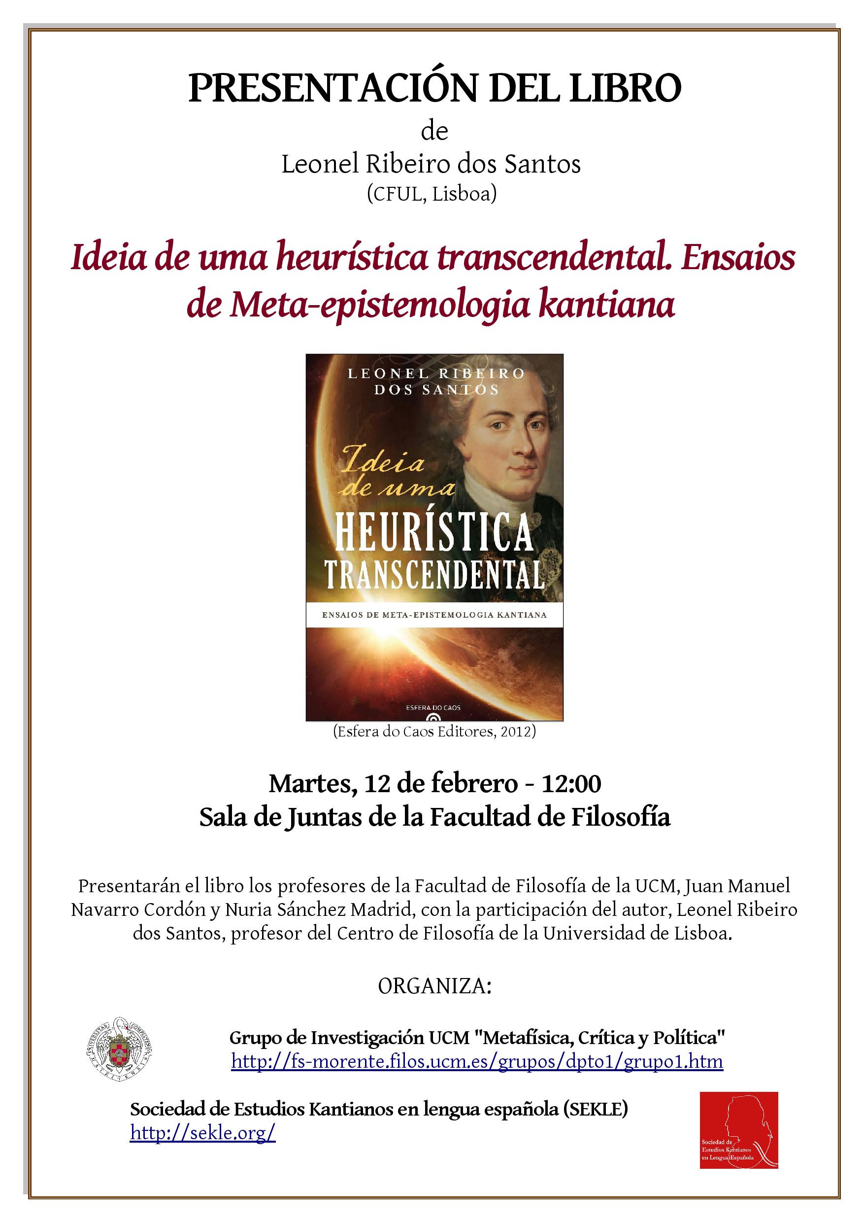 Presentación del libro de Leonel Ribeiro dos Santos (CFUL, Lisboa): Ideia de uma heurística transcendental. Ensaios de Meta-epistemologia kantiana
