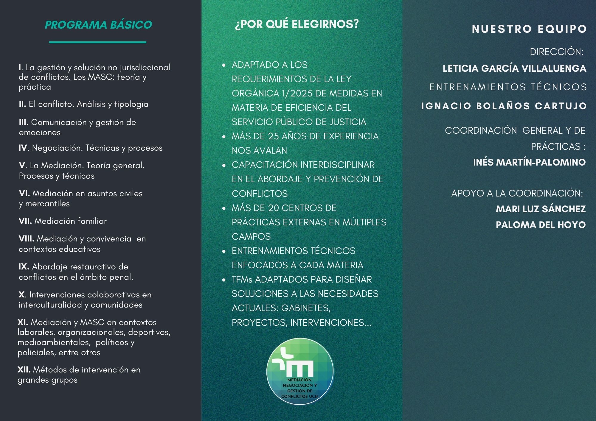 Con la Mediación y los MASC (Métodos Adecuados de solución de controversias), aprendemos a favorecer la solución positiva de los conflictos y a transformar pacíficamente las interrelaciones propiciando consensos. Desde esta convicción, en la Universidad Complutense de Madrid, venimos formando profesionalmente a personas mediadoras y gestoras de conflictos, desde hace 28 años, capacitándoles en las competencias necesarias para desarrollar de modo eficaz y responsable estas metodologías en ámbitos muy diversos.
