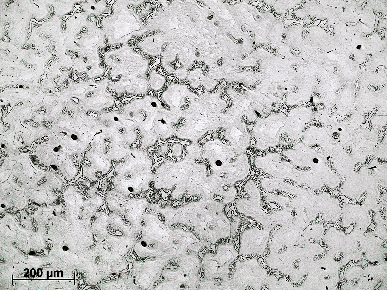 The alloy shows a microstructure of α-Mg dendritic grains and a completely divorced eutectic (α-Mg + β-Mg17Al12) at the interdendritic spaces due to non-equilibrium solidification. Some regions, where the cooling rate was slower, show a partially divorced eutectic or even a lamellar aggregate due to cellular solid state transformation (see AZ80 alloy). Small and polygonal Al-Mn intermetallics are also observed, preferentially at the interdendritic spaces.