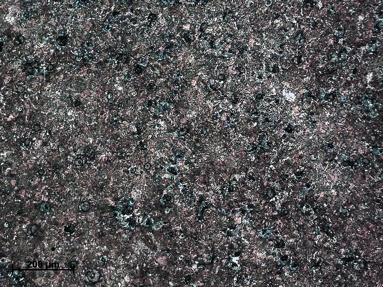 This is the same cast iron as the one in F8 specimen, but with a normalizing heat treatment. During this treatment, Fe3C dissolves and a structure consisting of austenite and spheroidal graphite is produced. Upon cooling in air, the eutectoid transformation predicted by the metastable diagram occurs (γ → α + Fe3C). This results in a fine pearlite matrix with several graphite nodules. Due to the oxidizing atmosphere during treatment, there is some decarburization of the surface, resulting a ferritic matrix.
