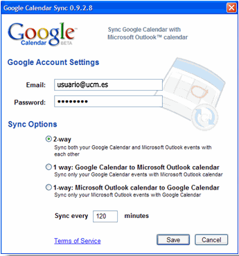 - Descarga Google Calendar Sync (versión 0.9.3.6) enhttp://dl.google.com/googlecalendarsync/GoogleCalendarSync_Installer.exe.