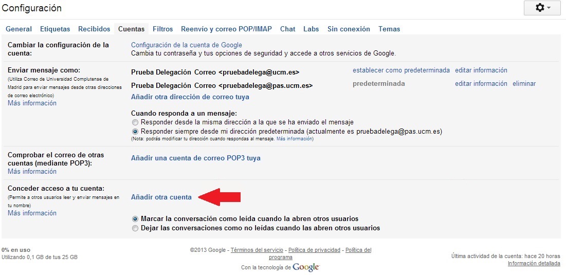Si deseamos permitir que otras personas accedan a nuestro buzón sin necesidad de conocer la contraseña, podemos compartir/delegar el acceso al mismo. Esta funcionalidad que provee Gmail, permite conceder el acceso a un buzón a un máximo de 25 personas.