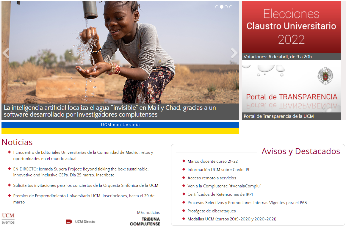 • El bloque de la izquierda mostraría una vista de las noticias séptima y siguientes y con enlaces a Eventos, UCM Directo y Tribuna Complutense.