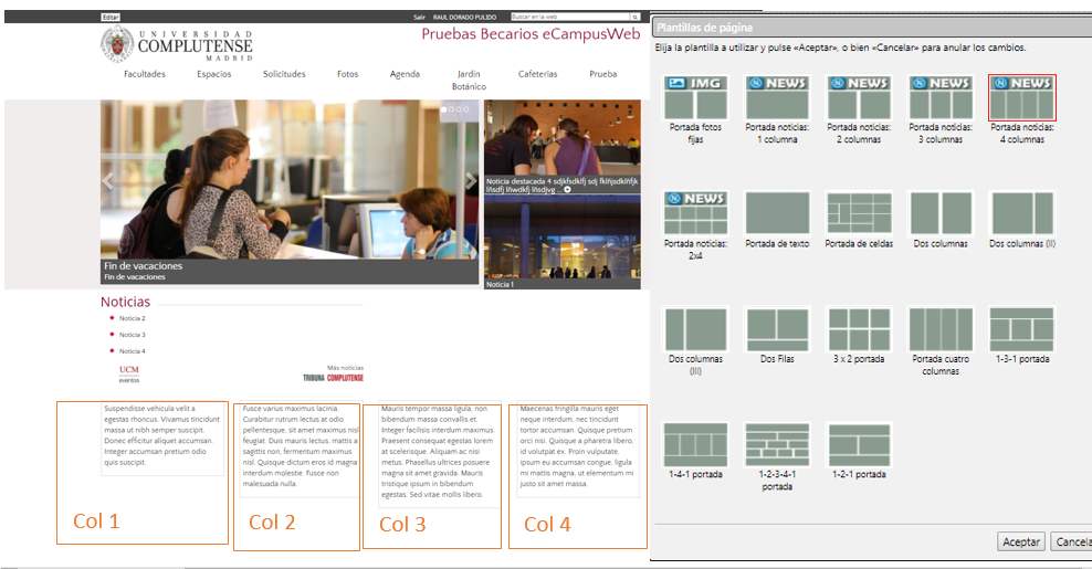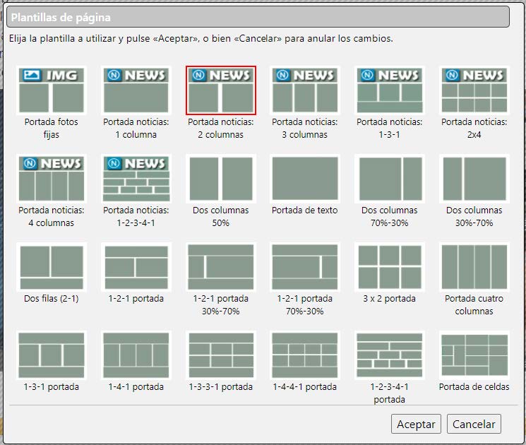 Hay que tener en cuenta que la página de portada del website dispone de plantillas especiales que no están disponibles para el resto de las páginas: permiten añadir imágenes de fondo de portada, noticias destacadas, noticias normales, avisos... Estas plantillas dotan a la portada de un aspecto más visual respecto a las plantillas de las páginas interiores del website.