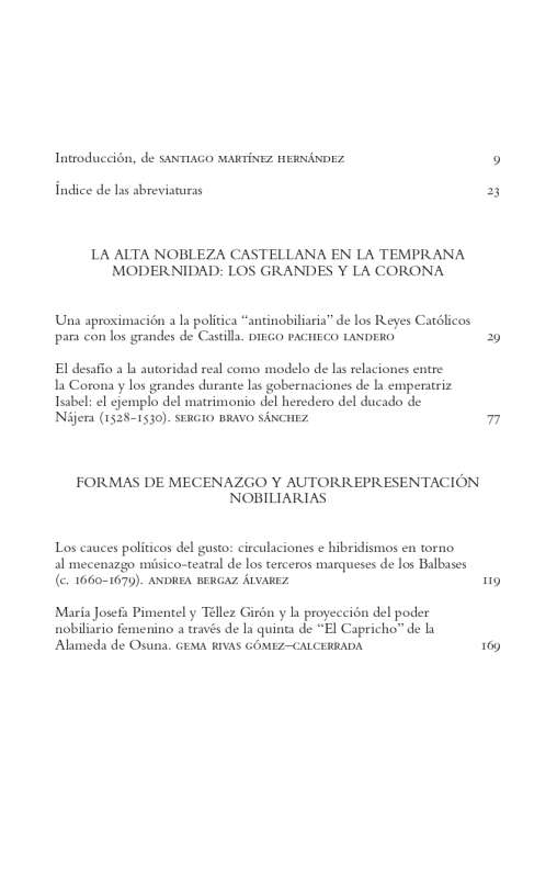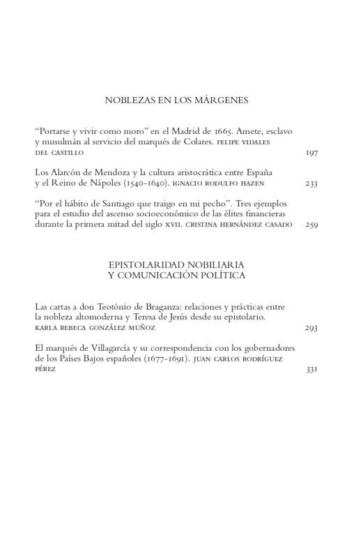 Abstract: La nobleza ha sido, hasta comienzos del siglo XX, uno de los principales actores del tiempo histórico. Por la multiplicidad de dimensiones que contempla su estudio, constituye un excelente laboratorio desde el que analizar el pasado. El interés que continúa despertando la nobleza –como en general las élites de la Edad Moderna–, del que este libro es una buena muestra, se ha visto reflejado durante las últimas décadas en una revitalización de sus investigaciones, fruto de una profunda renovación metodológica que ha contribuido a su mejor conocimiento. Este volumen colectivo recoge una selección de trabajos de jóvenes historiadores cuyos intereses de investigación –derivados de sus tesis doctorales– se han orientado al estudio de la nobleza de la época moderna. Comparten todos los textos el ánimo de ofrecer, a partir de metodologías que privilegian el análisis crítico de las fuentes documentales, nuevas miradas a viejos temas y a procesos y fenómenos desatendidos, menos conocidos o peor estudiados; de recorrer, en suma, nuevos caminos de investigación en torno a la nobleza y lo nobiliario.