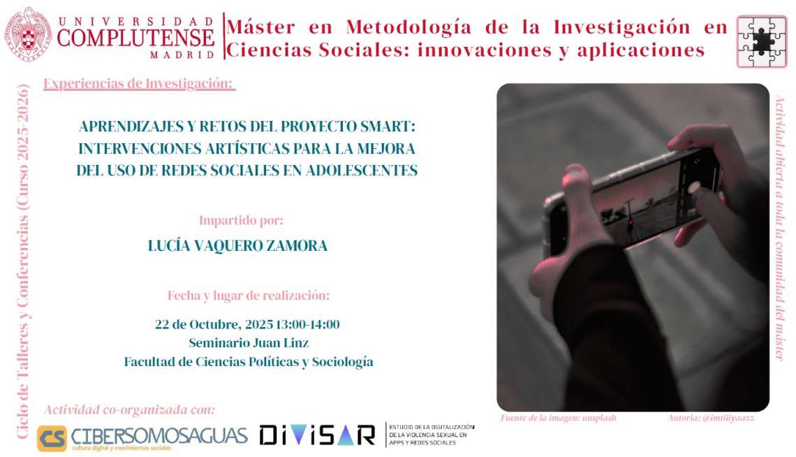 El próximo 22 de octubre de 2025 tendrá lugar la conferencia "Aprendizajes y retos del proyecto smart: intervenciones artísticas para la mejora del uso de redes sociales en adolescentes" a cargo de Lucía Vaquero Zamora.