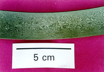 In addition, a very esthetic surface can be achieved if the steel is heat treated at high temperatures followed by slow cooling, prior to hot forging. The control of the heating and cooling allows to thicken the carbides to an adequate value, which makes after the forge, and after a slight chemical attack, become visible forming sinuous tracing bands of great beauty.