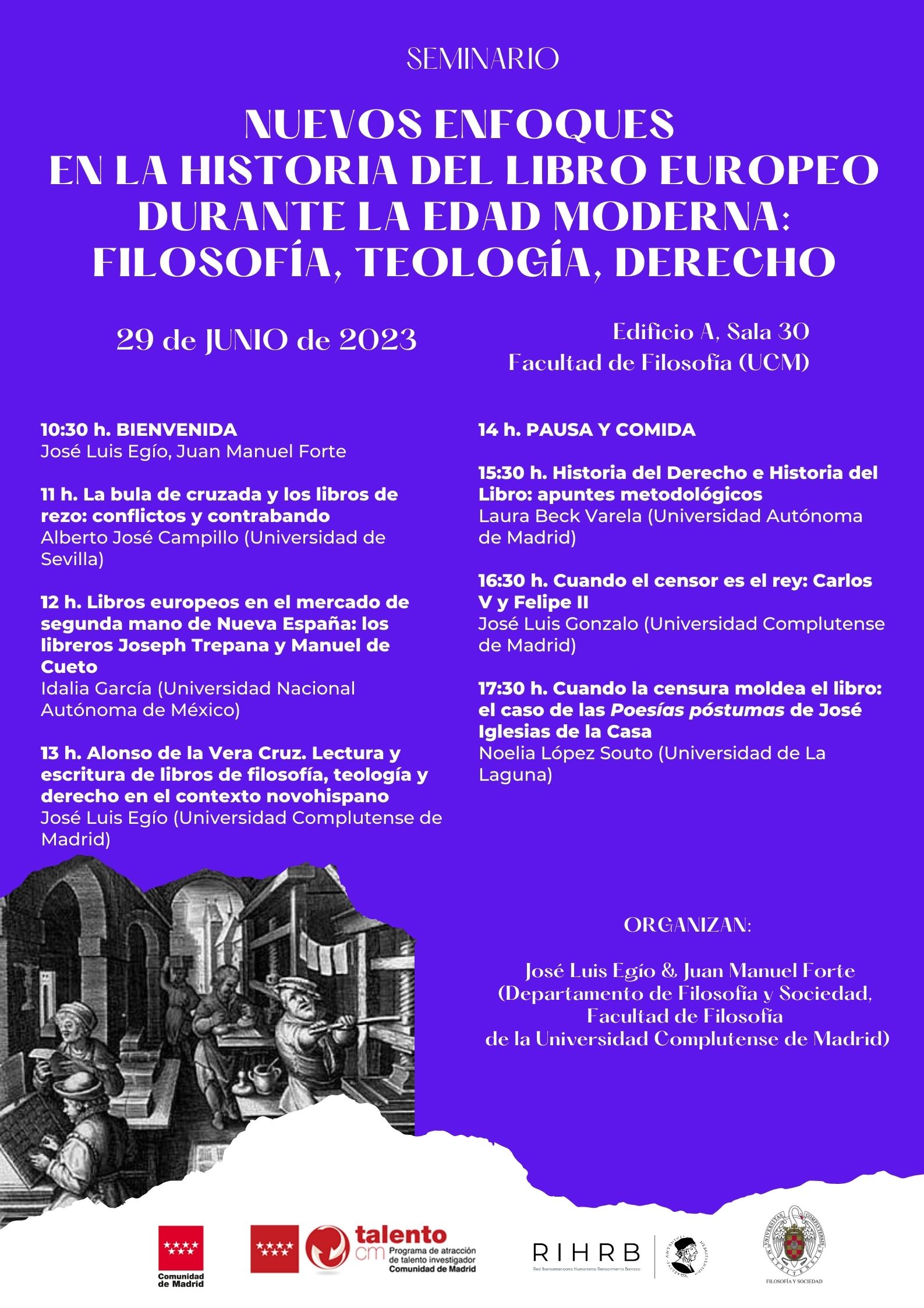 Presentación: Fruto de la colaboración entre el Ateneo de Madrid, el Departamento de Filosofía y Sociedad (UCM) y la Red Iberoamericana de Humanismo, Renacimiento y Barroco (RIHRB), el Seminario permanente de pensamiento moderno (SPPM) propone el siguiente título para para el curso 2022-23: Filosofía, teología y política en el horizonte moderno (siglos XV-XVII). En esta ocasión trataremos de analizar y debatir la génesis de la cultura moderna a través de las múltiples intersecciones existentes entre filosofía, religión y política. Con un enfoque analítico, pero también histórico y comparativo, el Seminario está particularmente interesado en mostrar las continuidades y discontinuidades de la cultura moderna respecto de periodos precedentes y del mundo contemporáneo.