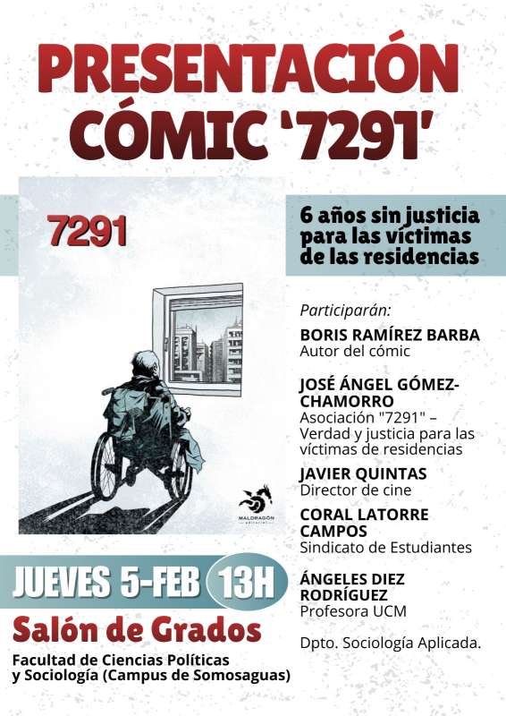 Presentación de Cómic 3 feb 2026 - 11:38 CETPresentación de Cómic "7291". Seis Años sin Justicia para las Víctimas de Residencias. Volver »