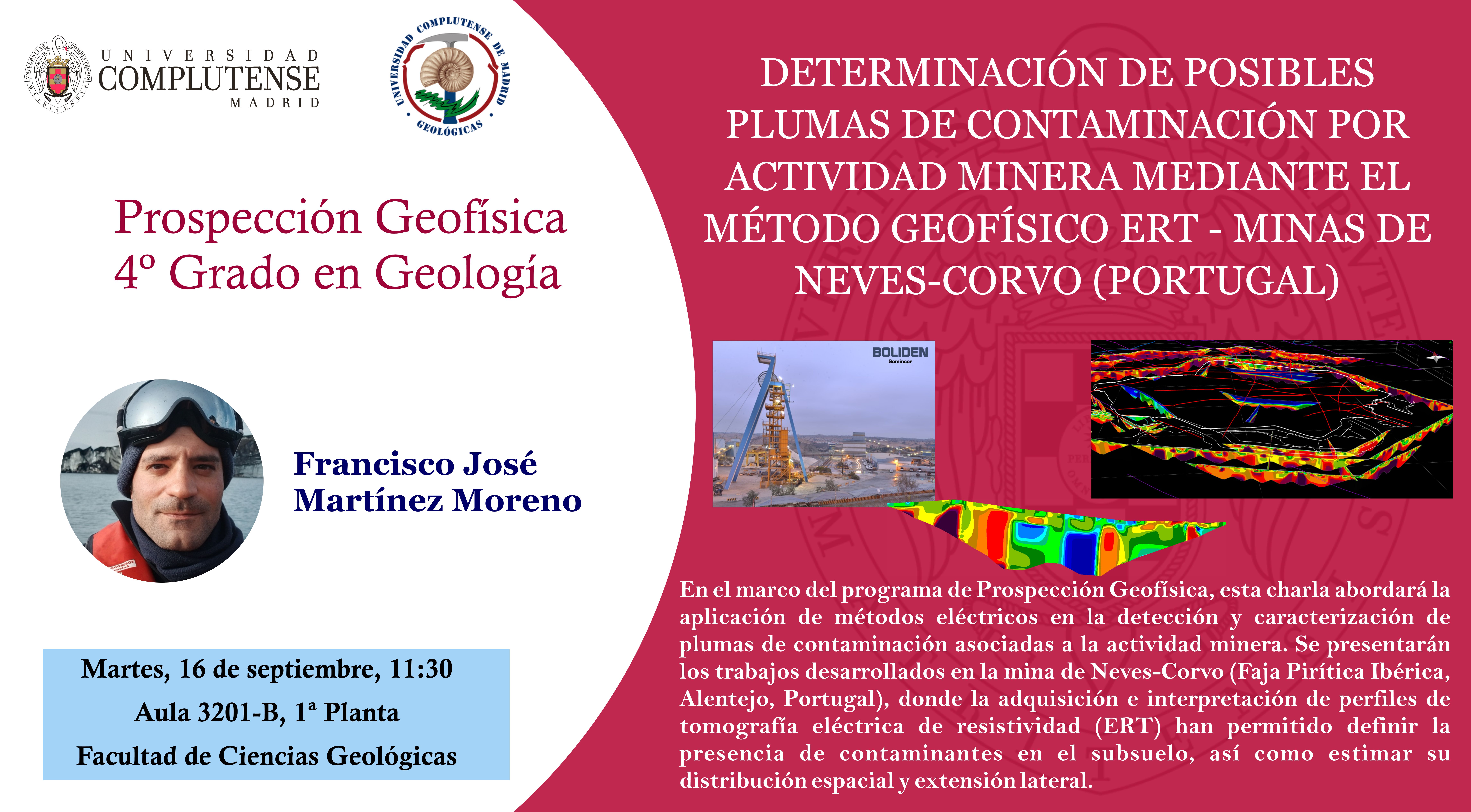 El próximo martes 16 de septiembre, en el marco de la asignatura Prospección Geofísica (optativa de 4º curso del Grado en Geología), se impartirá una charla sobre la aplicación de métodos geofísicos en la detección de contaminantes asociados a la actividad minera.