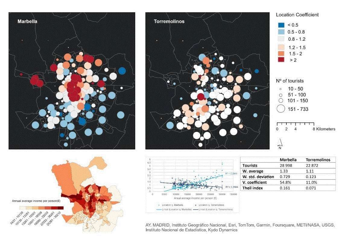 Urban income segregation manifests in tourist destination choices. We analyze the relationship between residential income levels and travel patterns from Madrid to the Spanish coastal destinations of Marbella and Torremolinos using mobile phone data from August 2021. By employing spatial analysis techniques such as location quotient (LQ) and Theil index, we assess the degree of specialization of Madrid’s neighborhoods in these destinations. Results show a clear income differentiation: high-income residents exhibit a strong preference for Marbella, while Torremolinos attracts a more socially diverse visitor profile. These findings highlight the influence of urban socio-spatial dynamics on tourism mobility and suggest that economic segregation shapes leisure travel choices.