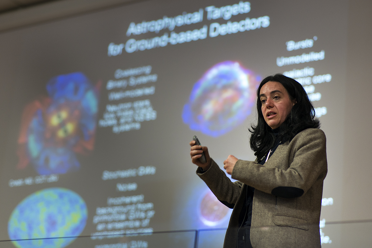 De acuerdo con la conferenciante, las posibles fuentes de ondas gravitacionales son el colapso de agujeros negros, los sistemas binarios de estrellas de neutrones, las explosiones e incluso un fondo estocástico, es decir caótico, como superposición de muchas señales. Cada una de esas fuentes emite diferentes señales y los fenómenos más violentos producen ondas de más intensidad.