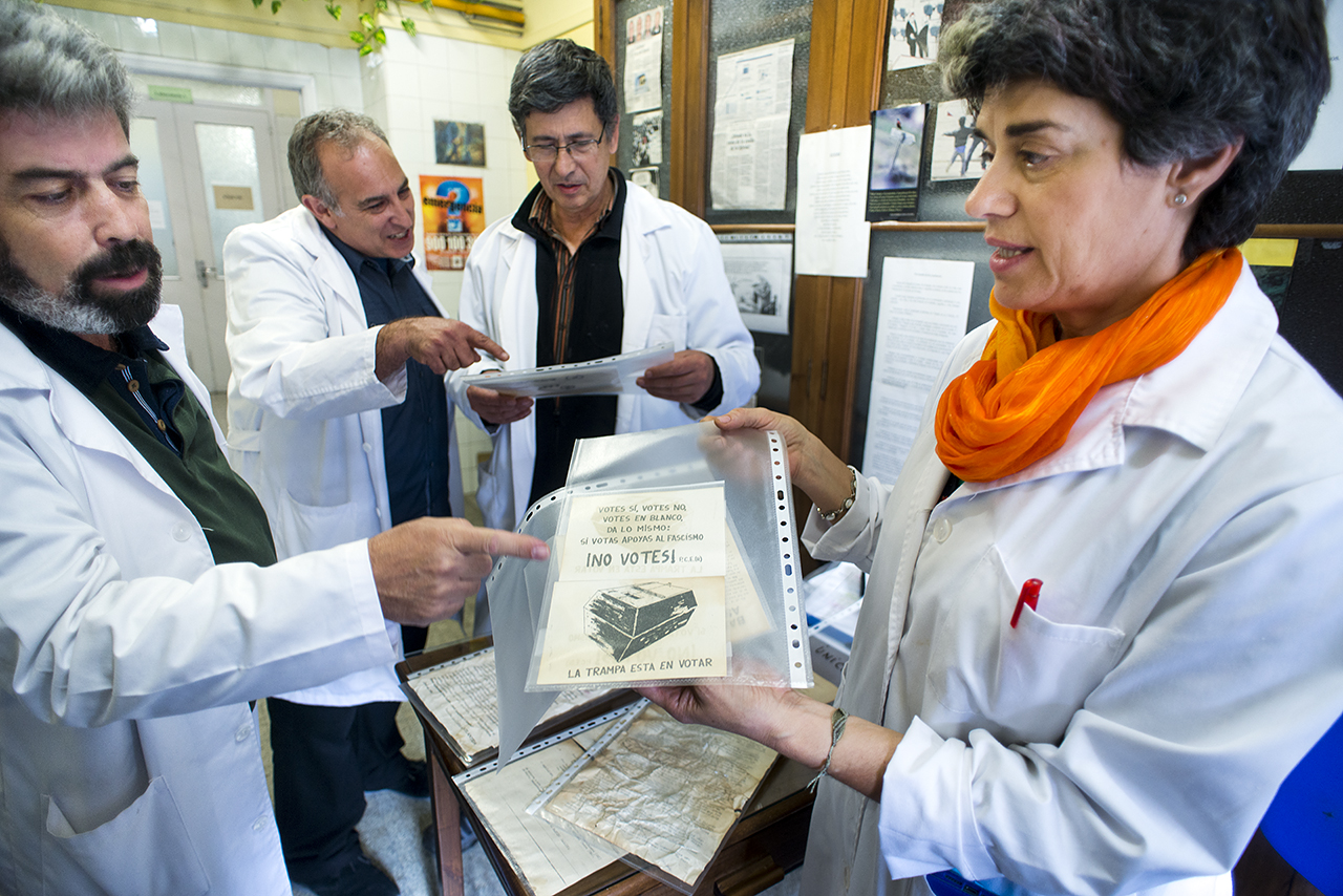 José Luis y Julián comentaron su descubrimiento a su compañero Gerardo Mateo y juntos se pusieron en contacto con Lourdes Sobrino y Olga Cilleros, técnicas de laboratorio que, además de realizar sus tareas cotidianas, se han propuesto organizar un museo de la Facultad con los utensilios, herramientas y maquinarias que van quedando en desuso. Lourdes y Olga se encargaron de custodiar los alrededor de 40 pasquines encontrados y de aplicarles algo de humedad para asegurar su conservación. Gerardo recordó que poco tiempo antes había visitado en el Museo de la Imprenta de Madrid una exposición titulada "Letras clandestinas", comisariada por el director del Departamento de Historia Contemporánea de la Facultad de Geografía e Historia, Jesús Martínez Martín. Se pusieron en contacto con él y le mostraron lo encontrado. Según cuentan, el profesor Martínez les confirmó que se trataban de pasquines de los años 70 que se repartieron por la Universidad. Textos como "Votes sí, votes no, votes en blanco, da lo mismo: si votas apoyas al fascismo", no dejaban lugar a dudas con la antigüedad de las octavillas. Algunas, incluso, eran algo más antiguas. También el profesor de la Facultad y antiguo secretario general del PSOE, Alfredo Pérez Rubalcaba, echó un vistazo a los pasquines. De alguno incluso identificó a su autor, un antiguo compañero de la Facultad, según les confió a Lourdes y Olga.