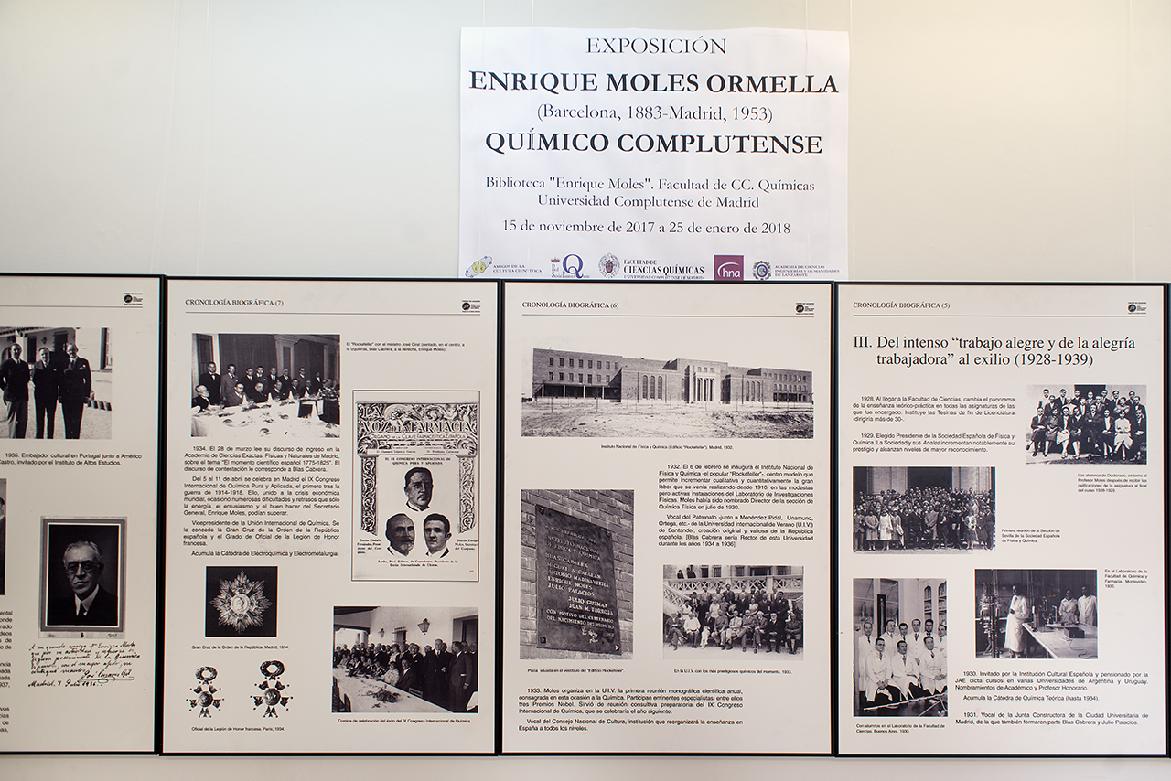 Adela Tercero, directora de la biblioteca de Químicas explica que la muestra es parte del Legado de Enrique Moles que el propio González Redondo ha ido atesorando durante muchos años. Añade que en principio se pensó en colocar vitrinas con originales de los libros del químico homenajeado, pero eso iba a quitar mucho espacio a la sala de investigadores, así que se optó por reproducciones de portadas de 32 de sus trabajos. Lo que representa una pequeña parte de sus publicaciones, ya que se le atribuyen casi 300 artículos.