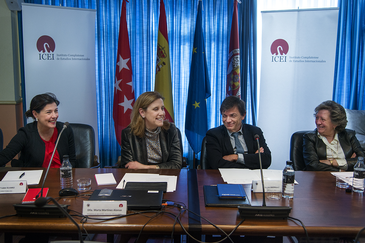 Marta Martínez quiso, como indicó en el preámbulo de su intervención, dar una serie de mensajes claros a las estudiantes que la escuchaban, "unas pequeñas recetas que he sintetizado y que quizá os sirvan para algo en vuestras carreras profesionales". La situación no es fácil para las mujeres y eso que "indudablemente se ha avanzado mucho", pero aún "hay retos pendientes, como la presencia de mujeres en puestos de liderazgo, en lo que queda mucho para avanzar. El gap de género en términos cuantitativos sigue siendo importante: en los consejos de administración de las empresas del Ibex 35 las mujeres son el 20 por ciento. Es mucho más que hace cinco años, pero aún es una gran diferencia", explicó la presidenta de IBM España, quien estuvo acompañada durante su charla por el rector Carlos Andradas, la presidenta del Consejo Social de la UCM, Pilar González de Frutos, y la directora del ICEI, Isabel Álvarez.