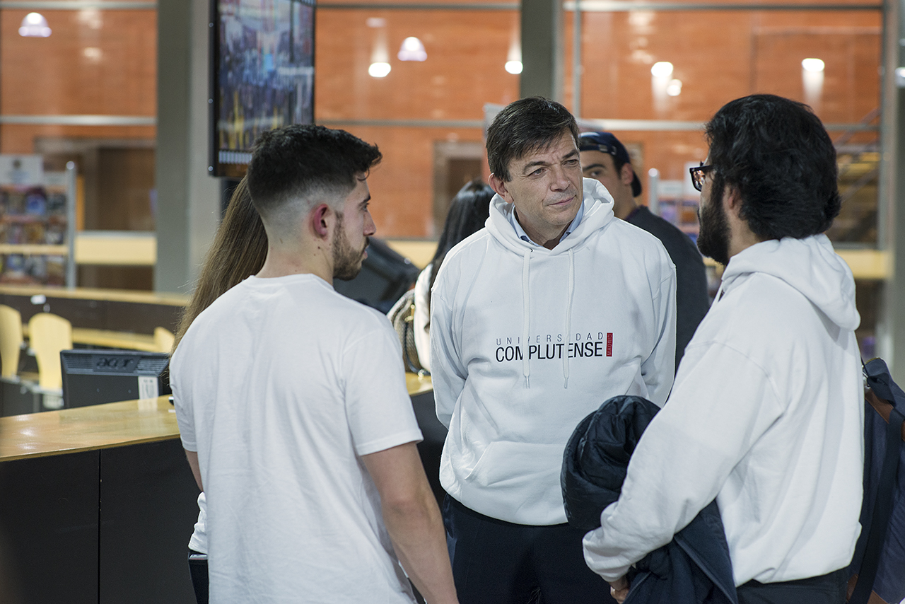 "Quiero agradeceros de corazón todo el esfuerzo, entrega y dedicación que habéis puesto en AULA. Sois los mejores embajadores de la Universidad Complutense". El rector Carlos Andradas no ha querido un año más dejar sin agradecer y reconocer la labor de los estudiantes que se desplazaron durante cinco días, del 28 de febrero al 4 de marzo, a Ifema para atender el stand de la UCM en la más importante feria educativa que se realiza en España. Fueron 120 estudiantes voluntarios y 30 becarios los que, acompañados por funcionarios y personal del Vicerrectorado de Estudiantes y las diferentes unidades y servicios ubicadas en el Edificio de Estudiantes, atendieron a muchas de las 140.000 personas que pasaron este año por AULA.