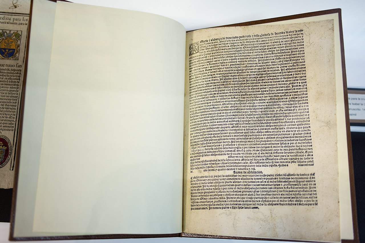 La exposición "La imprenta incunable en España", que se puede visitar hasta el 11 de mayo en la sala de exposiciones de la Facultad, está comisariada junto al profesor De los Reyes por Susana López del Toro, una de las mayores coleccionistas de libros en miniatura del país. La muestra hace un repaso a la introducción de la imprenta en España, situando como punto de partida la impresión del Sinodal de Aguilafuente en 1472, que contiene las actas del sínodo que se celebró en esta villa segoviana, y que está considerado el primer texto impreso español. Tras su llegada a Segovia, se tiene constancia del uso de imprentas en Barcelona, Valencia o Sevilla, en 1473, Zaragoza, en 1475, y La Puebla de Montalbán, hacia 1476.