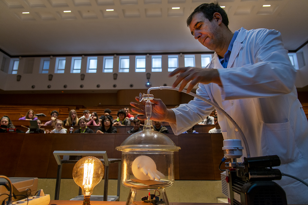 "En la ciencia hay muchas fórmulas y cosas de esas, y muchas horas de trabajo detrás, pero también como podéis ver aquí estos días puede ser muy divertida", les comenta Carlos Romero a los estudiantes, ya a punto de entrar en materia en el taller de "Luz y sonido", que desde las 11 de la mañana de este 4 de noviembre imparte en el Aula Magna de la Facultad. Ya con los primeros datos, consigue hacerse con la atención de su audiencia. La luz y sus ondas electromagnéticas se transportan a una velocidad de 300.000 kilómetros por segundo, o, "dicho de otra manera, a 1.080 millones de km/hora, lo que equivale a dar 7,5 vueltas a la Tierra en un solo segundo". Su primer experimento, sin embargo, no trata de explicar esa velocidad u otras características de la luz, sino de dejar claro que para que el sonido y sus ondas mecánicas se trasladen hace falta la presencia de otro elemento. Si en una urna se encierra una alarma con un amplificador, esta se seguirá escuchando aunque sea más débilmente cuando se cierre la urna. Si se extrae el aire de la urna, en cambio, dejará de escucharse; las ondas sonoras no tendrán quien las transporte".