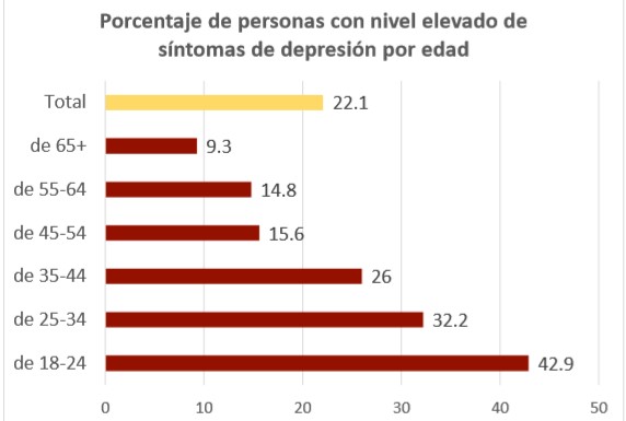 En el segundo informe se destaca que uno de cada cinco españoles presenta síntomas clínicamente significativos de depresión, sin diferencias por género estadísticamente significativas. En cuanto a la edad, los mayores de 45 años muestran tasas menores de depresión, siendo más frecuentes los síntomas en el grupo de edad más joven, el que va de 18 a 24 años.