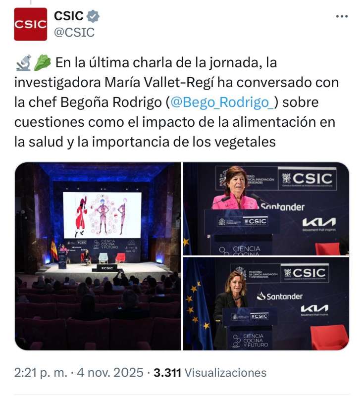 Science, cuisine and the future Conference: A unique opportunity. CSIC November 2025 3 nov 2025 - 12:54 CETDr. María Vallet-Regí gave the lecture ‘Future and Longevity’ at the Science, cuisine and the future Conference: A unique opportunity. CSIC and the Mario Sandoval Foundation. 3rd and 4th November, Madrid. Galería Imágenes Volver »